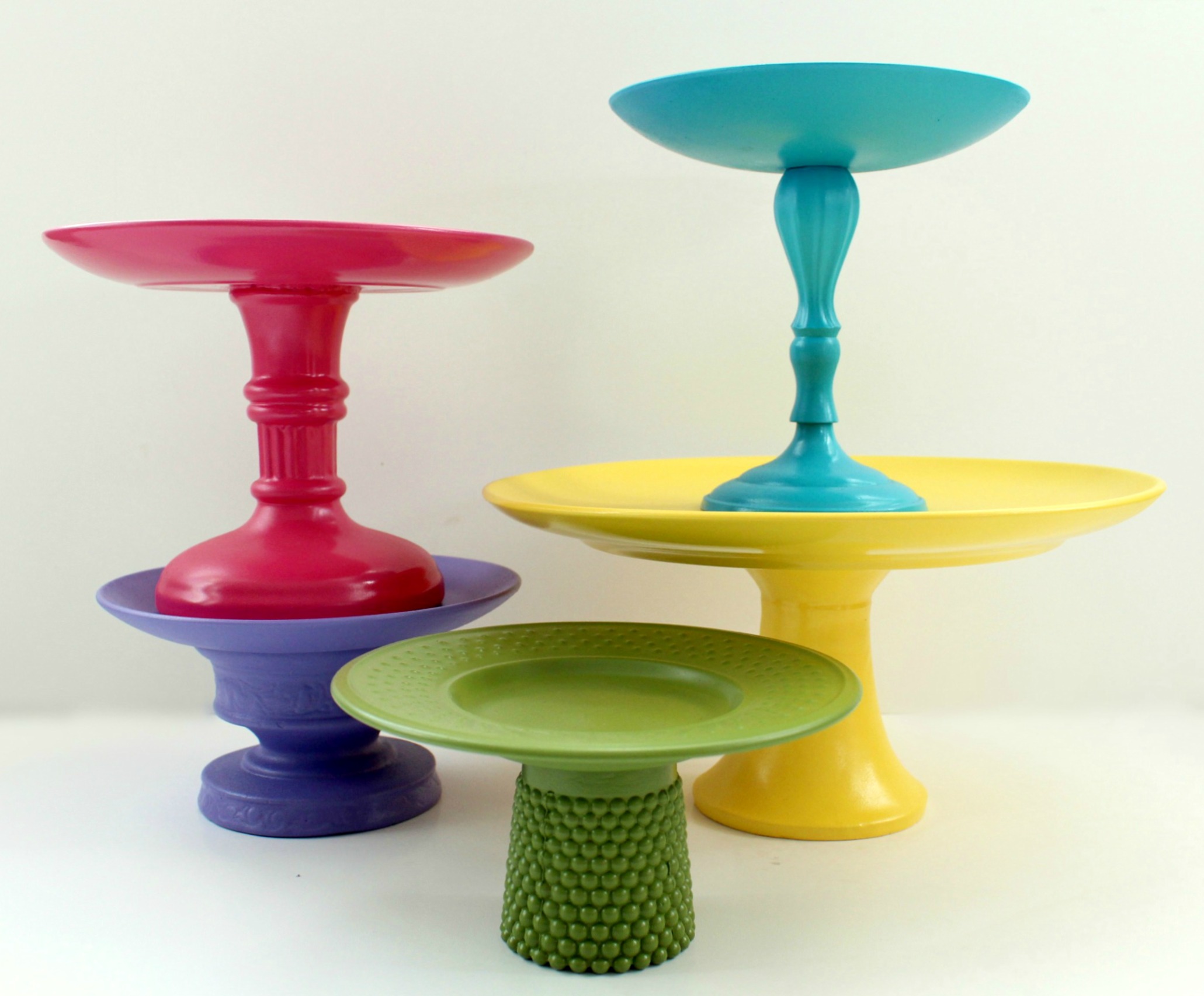 You can easily convert your household dishes or fun mis-matched thrift store dishes into beautiful cake stands. I took a quick stop to the $1 store and purchased various plates, bowls, candle sticks and flower vases.